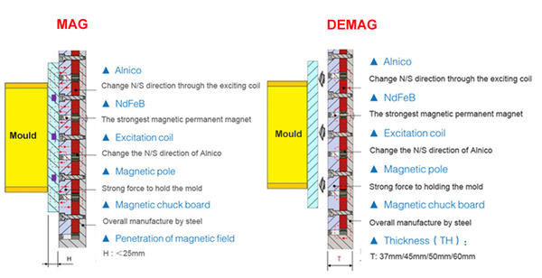 | Clamping force | The honeycomb structure is optimized the inside of magnetic plate, which ensure the rigidity and strength of the magnetic plate itself, as well as the magnetic force can be concentrated in a reasonable layout, so, no matter what size about the mold, the template is with more powerful clamping force | The ordinary structure clamping force is dispersed and not uniform |