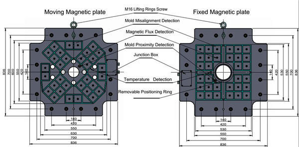 The magnetic clamping system is used to fix the mold on the injection machine.Magnetic plate is